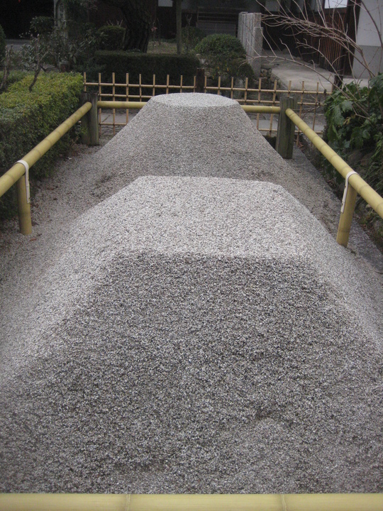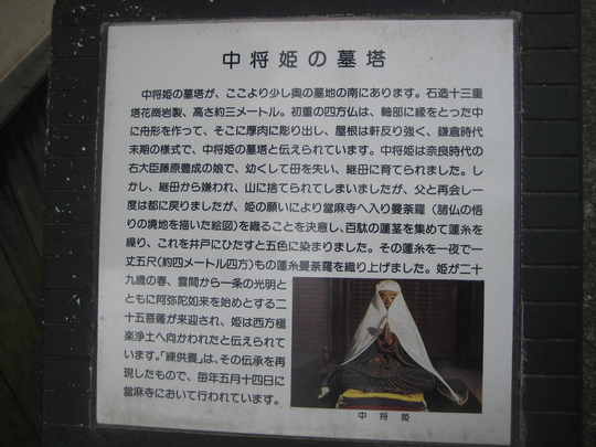 当麻寺から石光寺へ行く道すがらに中将姫の墓塔があります 右は想観の沙(すな)と呼ばれています。手前の方形は、強く安定した形に見えますが、崩れやすくて角も欠けやすいことから私たちの姿を現しているそうです。奥の円錐形は絶対の世界、すたれない世界を現わしており、悟りを開いた仏を意味する形なんだそうです。我々凡人には、遠く及ばない世界なんでしょうね |
