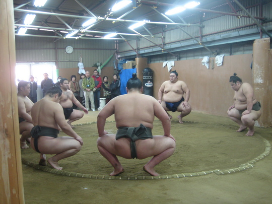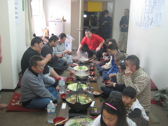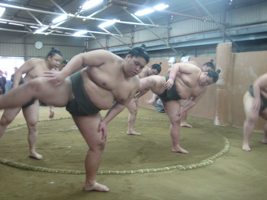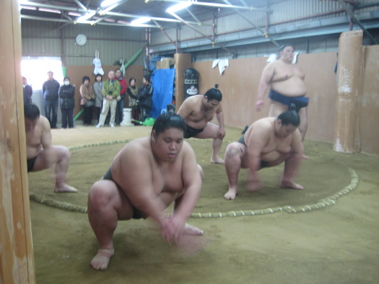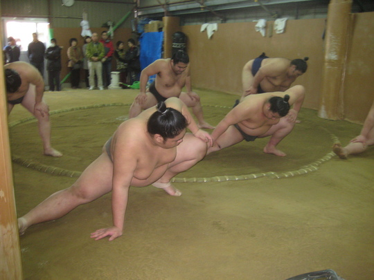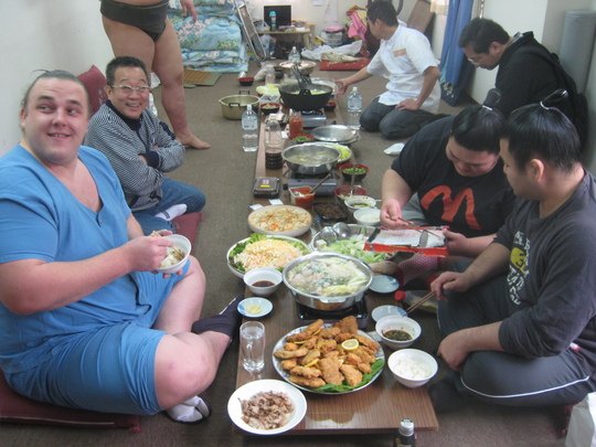 一日4回ぐらい食事するそうです。朝稽古の後は朝ご飯になるのでしょうが、みな、丼ばちに3バイぐらいぺろりとご飯を平らげてしまいます。見ていて気持ちがいいですね、その食べっぷりが…。