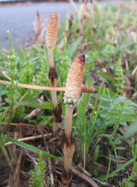 堤の斜面は杉菜でおおわれていますが、日当たりのよい場所にまとまって土筆が顔を出しているのです。