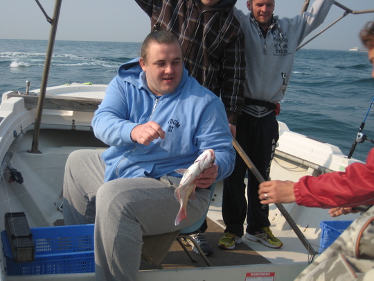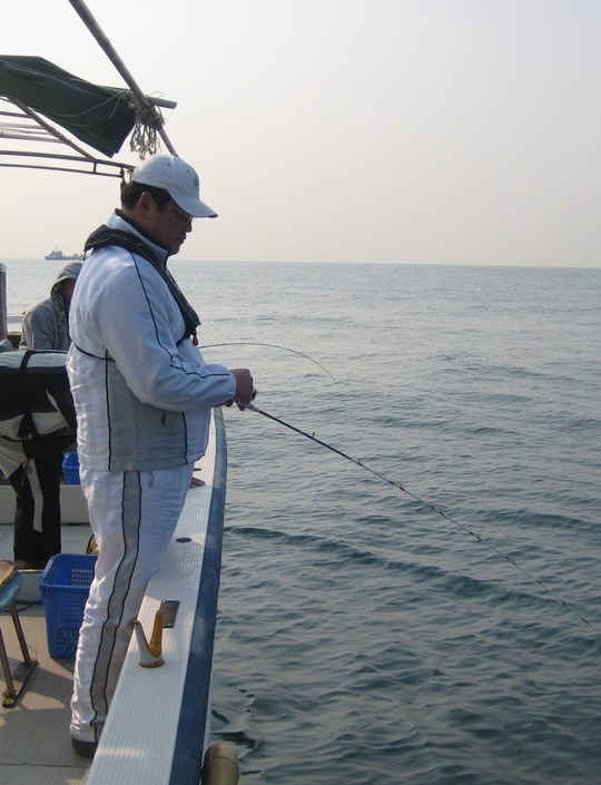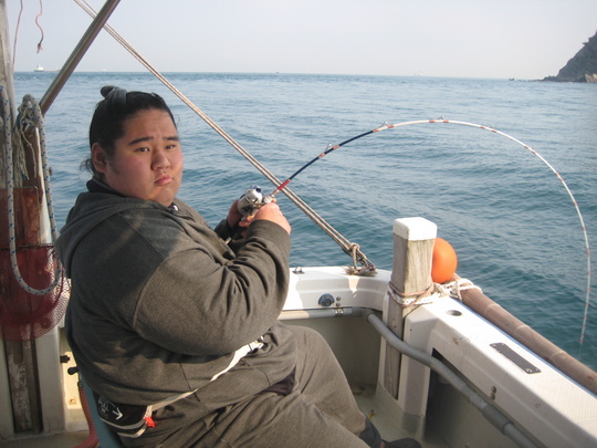 尾上部屋から参加したのは、尾上親方と大関バルト、幕下の天草と浜大府の4人です。2隻の船に分乗して釣りに出ましたが、体重188kgのバルト関が船に乗り込むと、やはり傾きましたね。バランスを取るのが大変でした。