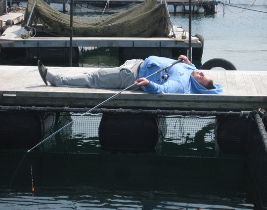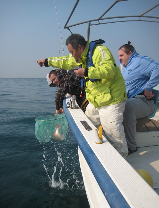 関取衆は全員初めての釣りでしたが、さすがに釣り好きだけあってすぐに要領を飲み込み、全員が目出度くマダイの顔を見たことろで、第二ラウンドの海上釣り堀へと向かいました。