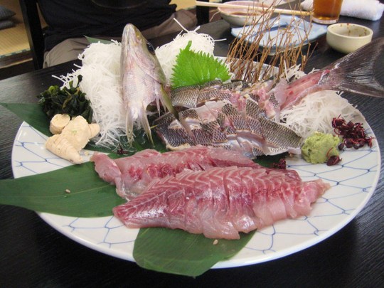 さて、酒の肴になる一品ものをいろいろ注文したのですが、ダルマオコゼの薄造り、という珍しいメニューに魚好きは飛びついたのです。が、水槽に生かしてあるというので見に行ったら、残念ながらオニオコゼでした。紀州ではオニオコゼをダルマオコゼと呼ぶんだろうか?。