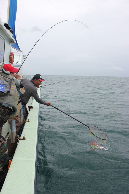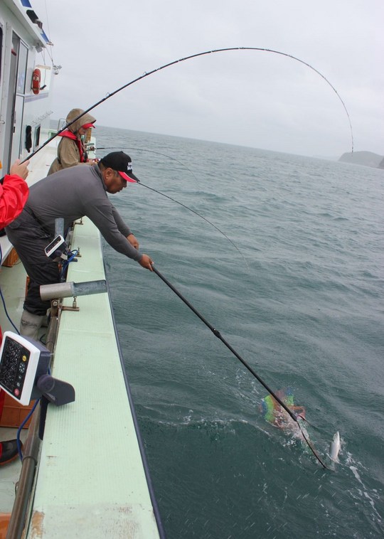 東山さん、ぶっちぎりの5匹。1匹はテレビカメラに収めている間に暴れて海へ帰ってしまったので、6匹の釣果が5匹になってしまいました。