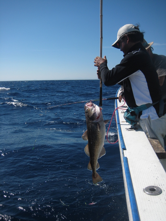 マダラがいるのは、経ケ岬の沖にある浦島グリよりさらに西側、水深250mほどの場所です。永浜いりあさんと二人で、サンマの切り身をエサにでっかいタラを狙ったのですが、この日は10kg近い大型は船中で2匹釣れただけでした。いりあさんにも2匹釣れたのですがいずれも小ダラでした。船長の話では今年のタラは、でっかいか、小さいかで、中間がいないそうです。