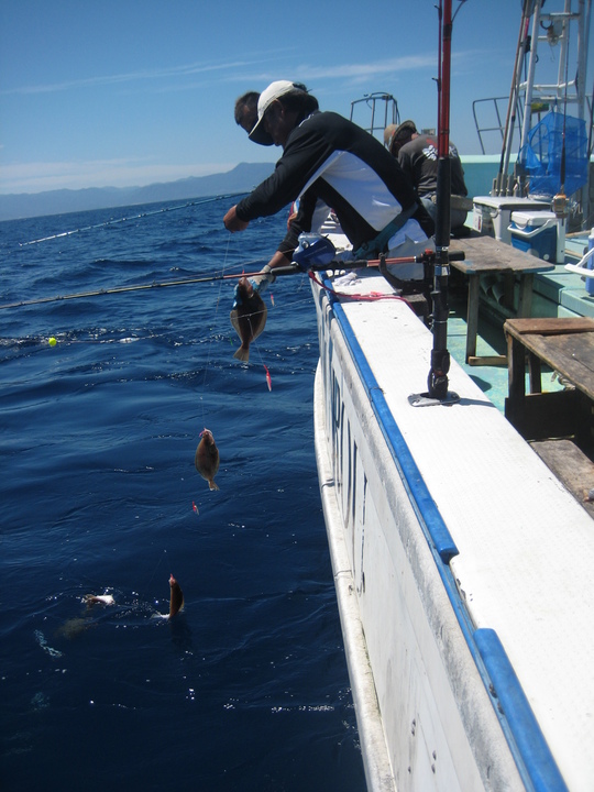 マダラ釣りの後は、さらに西側の水深200mラインへ移動して、地元でエテガレイと呼んでいるソウハチを狙いましたが、サビキ仕掛けに鈴なりになって上がってくるカレイ釣りを初めて体験しました。