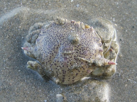 キンセンガニは、金線蟹と書きます。十脚目キンセンガニ科に分類され、太平洋岸など温暖な砂浜に生息しています。