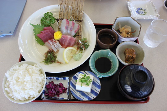 この日のお造りは、潮ノ岬産?の天然ヒラマサに勝浦産のマグロ、甘イカの三種盛りでした。これに小鉢ものが3つ、冷や奴に味噌汁、漬けものが付いているので、お腹いっぱいになりました。