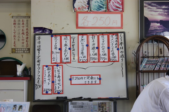 メニューを見ると天然ヒラマサや勝浦直送の生メバチマグロの造り、甘イカ(アカイカ)の造りなどがあって迷いましたが、いろいろ食べたいので造り盛り合わせ定食にしました。造り盛り合わせが1100円で、250円プラスすれば、小鉢ものや味噌汁が付いた定食になります。