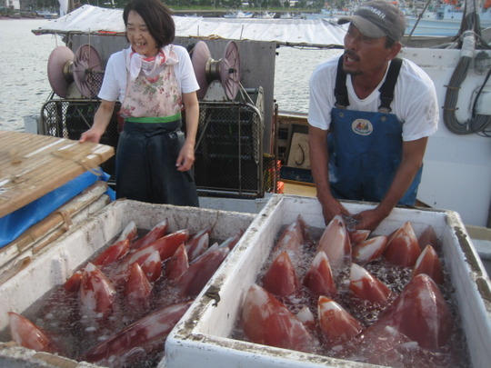 近寄ってみると、その漁船はタルイカ漁から帰ったばかりで、きっとご夫婦だと思うのですが、二人でせっせとタルイカを水揚げしているのです。