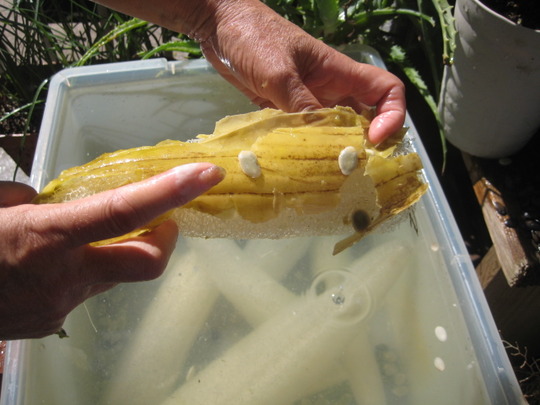 昔、自宅の庭で植えていた時、祖母が夏の一番暑い時期でしたが、茎を切って、茎から出てくる液体(へちま水)を集めて化粧水みたいに使っていたのを思い出しました。
