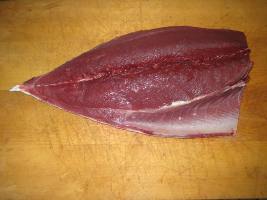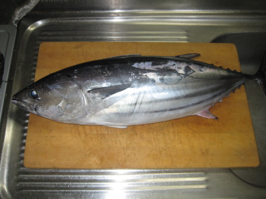 和歌山県田辺沖の気象ブイで釣ってきたという戻りガツオとビンタ(キハダの子供)をいただきました。