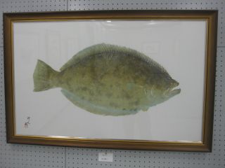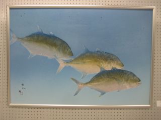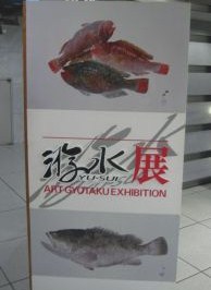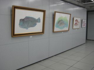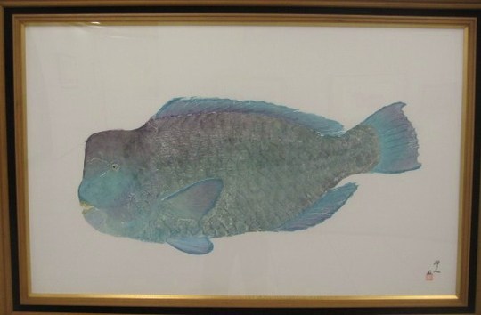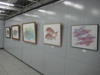直接法によるカラー魚拓で主宰者である谷口岬人さんの作品を中心に、ヒラメやカスミアジ、マハタにマダイ、マゴチなどざっと50点余りが展示されています。