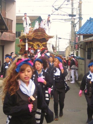 面白いのは、地車を曳航するそろいの法被を着た若い女の子たちがそれぞれ趣向を凝らした髪型やお化粧をして参加することです。それを見ているだけでも楽しいですよ。