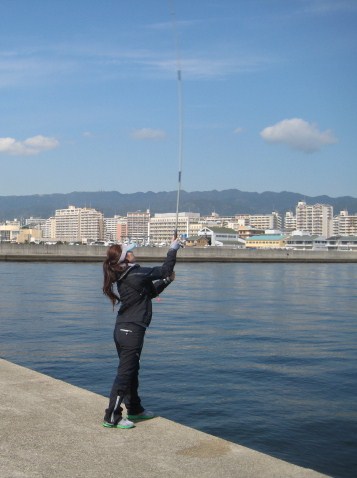尼エサ西宮店の久保店長に指導していただきながら、まずは仕掛けを投げる練習から始めましたが、なかなか呑みこみが早くて、30分もしない内にサヨリの遠投仕掛けが30mぐらいは投げられるようになりました。