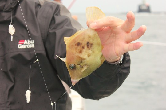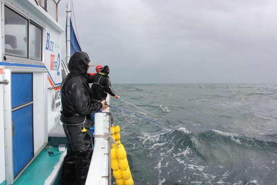 朝から雨。前線が通過するとかで途中から風雨が強くなり、おまけに波まで高くなって最高のタフコンディションでのカワハギ釣りになりました。