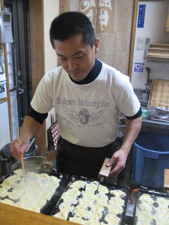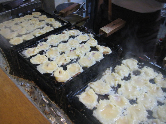 子焼きを転がしながら冷まし、ころ合いよ
