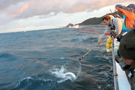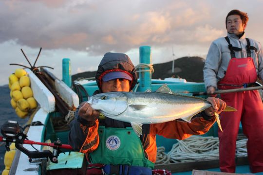 まだ真っ暗なうちに出船し、日ノ岬沖のポイントで待機して釣り船が集まるのを待っています。そして、真っ先にアンカーを下ろせるのが美浜町の船なんです。日ノ岬は美浜町にあるため地先の船から優先的にという配慮なんでしょうね。続いて日高町、由良町の船とアンカーを下ろしていき、ようやく釣りがスタートします。