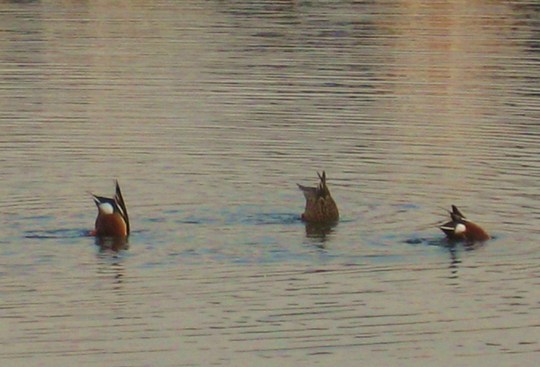 ハシビロガモは、群れを作り水中にくちばしを浅くつけてぐるぐるぐると時計回りに回転し続ける動作をよくやります。
