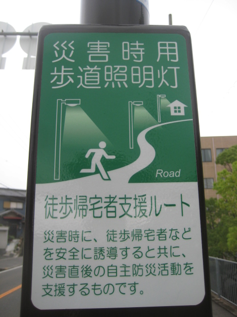 たとえば、歩道には徒歩帰宅者支援ルートの表示や、ソーラーパネルを配した災害時用歩道照明灯などです。