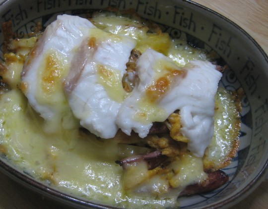 で、それをまねて、前の日に食べきれなかったマダイの刺身を使ってやってみました。レンコンの代わりにエノキダケを敷き詰め、マダイの身を乗せてからとろけるチーズをパラリンコして焼きあげたのです。仕上げのカツオ節を省略したのは、主役がマダイの身だったからです。魚同士が喧嘩したら困るかなと思って…。