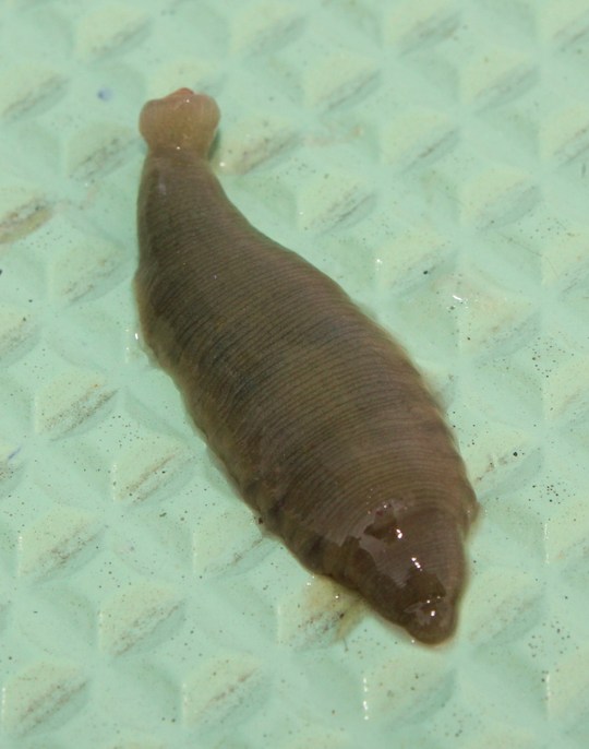 海に住むヒルは同定するのが難しく、専門家でないと分からないそうですが、多分、ウオビル科のウオビルかヒダビルの仲間ではないでしょうか。