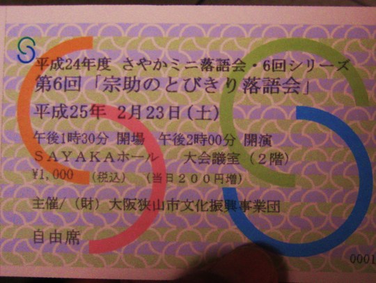 23日の土曜日、大阪狭山市のSAYAKAホールで開かれた「宗助のとびきり落語会」に行ってきました。会場はSAYAKAホールの大会議室。定員は100人とのことでしたが、ほぼ満員の盛況で、午後2時にスタートしました。