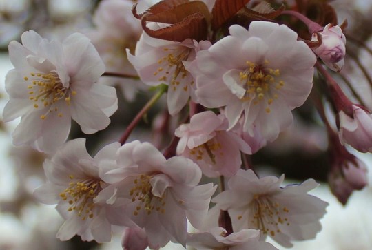 このサクラの特徴は、葉柄、花柄が薄い毛で被われる八重桜で、ガク片が10枚、ひとつの花に雌しべが2〜4本ある珍しいものだそうです。