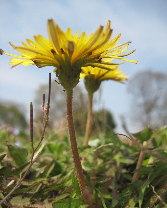 西洋タンポポは、総苞片と呼ばれる額のようなものが反り返って下を向くのが特徴で、カンサイタンポポはこの総苞片がほとんど上向きで内片に密着するからこれはカンサイタンポポかな? |