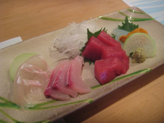 造りの三種盛りは、ヒラメとカンパチとマグロ。カンパチは、よお活かってました。