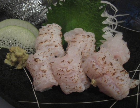 今年の初もん、活けハモの炙りです。初もん食べたら寿命が3年延びるとか…。