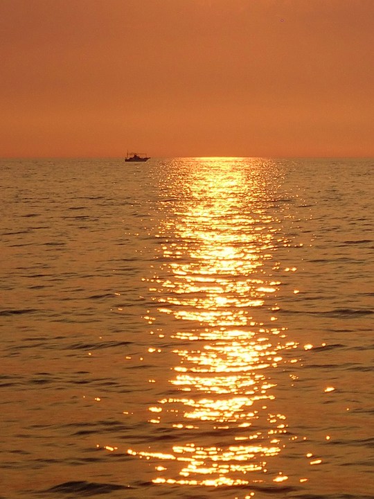 福井県・小浜沖で見た日の入り前の景色です。遠くに浮かんでいるのは、イカ釣り船の姿でした。何度見ても飽きない景色ですね。