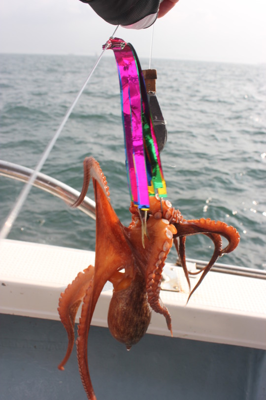 船長が、今年はタコが少ないと言っていた通り、乗りはよくありませんでしたが、1時間ちょっとやって新子を3匹、ついでに空港連絡橋の橋ケタ周りで黄アジのお土産も釣らせてもらって、勇躍、帰ってまいりました。