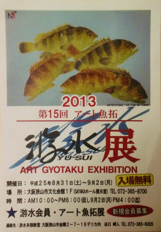 8月31日(土)から9月2日(月)の3日間、大阪狭山市文化会館SAYAKAホールの展示室で、第15回アート魚拓「游水展」が開かれます。