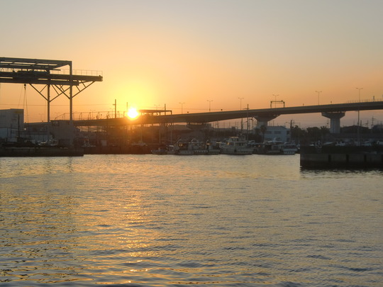 湾岸線の彼方から昇る朝日を見ながら出船です。
