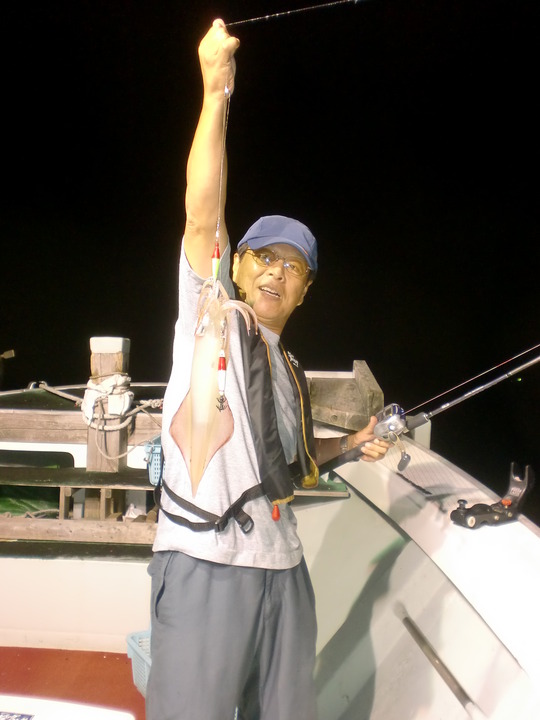 でも、最初ぽろぽろ、中ぱっぱで、終盤は入れ乗りもあって多い人は80パイ余り、少ない人でも30〜40パイの釣果で、ほぼ満足して竿を納めました。僕は、この日はずっとメタルスッテの釣りばかりやっていたので、数は30パイほどでしたが、型のよいシロイカが多かったし、シロイカが触腕を伸ばしてスッテをっ触りに来る感触やフォール中に乗る面白さを堪能させてもらいました。