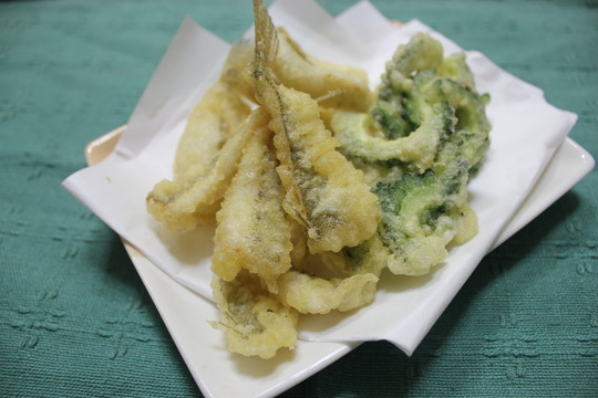 蔵元に近い紀ノ川で釣ってきたハゼとゴーヤの天ぷら。