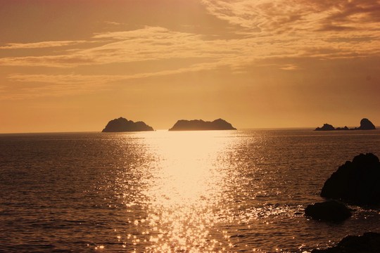中央に見える島が和歌山県の湯浅湾に浮かぶ刈藻島(かるもじま)、右に見えるのが毛無島(けなしじま)です。そして、撮影場所は、湯浅町栖原の端崎です。県下の夕日百選に選ばれた場所ですから、さすがにシチュエーションはいいですね。