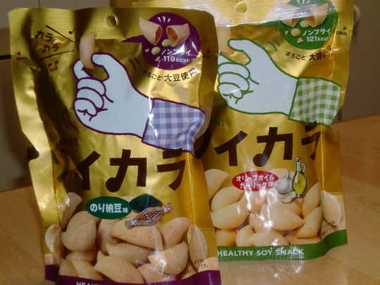 大豆を主原料にしたヘルシーなスナックだというので、のり納豆味とオリーブオイルガーリック味を買って帰りましたよ。
