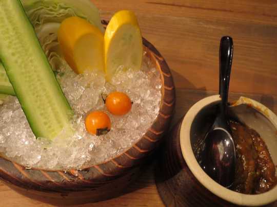 つきだしは、新鮮野菜。きゅうりとズッキーニーを特製の味噌をつけていただきます。味噌はちょっと甘かったけど、なかなかいいお味。