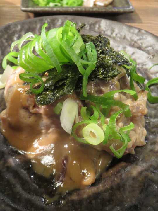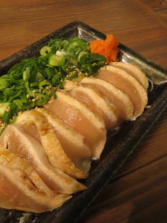 続いて地頭鷄の胸肉を使ったたたき。九条ネギをたっぷり、薬味も絡めていただくと、なかなかいい感じ。さっぱりしてて吟醸酒のお供によさそう。