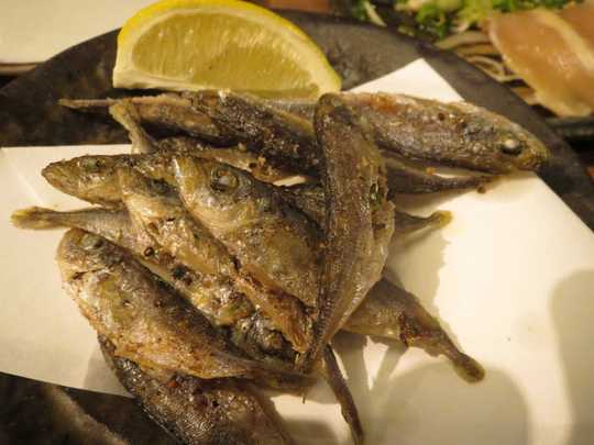 これは豆アジの唐揚げ。マキシマムな調味料が振りかけてあるそうです。ビールのお供によかったね。